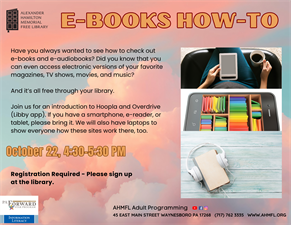 Join us for an introduction to Hoopla and Overdrive (Libby app). If you have a smartphone, e-reader, or tablet, please bring it. We will also have laptops to show everyone how these sites work there, too.