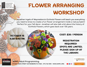 Jonathan Ingels of Waynesboro’s Eichholz Flowers will teach you everything you need to know to create a fun flower arrangement inside a real pumpkin! Perfect for your fall decor. Jonathan will also talk a bit about the history of Eichholz Flowers, which goes back over 130 years.