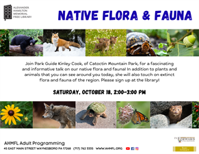 Join Park Guide Kinley Cook, of Catoctin Mountain Park, for a fascinating and informative talk on our native flora and fauna! In addition to plants and animals that you can see around you today, she will also touch on extinct flora and fauna of the region. Please sign up at the library!