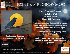 Join guest teacher Selena Hill to create your own version of this seasonal scene featuring a crow on a moonlit night. The library will serve sparkling cider and refreshments. And. . . wear your best costume for a chance to win a $25 Zoe’s Chocolate gift card!