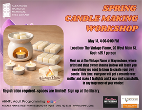 Meet us at The Vintage Flame of Waynesboro, where artist and shop owner Shauna Snidow will teach you everything you need to know to create your own candle. This time, everyone will get a ceramic wax melter and make 4 tealights and 3 wax melt clamshells, in any fragrance of your choice!