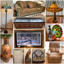 MCCONNELLSBURG PA Estate closing Jan 9th with 7 STAINED GLASS lamps & figural lamps-peacock, butterfly, etc; Lancer sofa; Pride lift chair; oak slant front secretary desk; MCM console, dresser, chest-on-chest & cedar chest; curio; power recliner; rocker gliders; oak table/chairs; patio set; washer; dryer; Bose system; lg Satsuma vase; Melodies-in-Motion clocks; art glass; signed artwork-Dachlin, Lambson, Hansen; reverse paintings; Stratford figural birds; Shark vac; Edenpure heater; TOOLS; more.