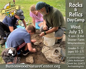 For students completing grade 3 through age 17. A Discover series program combining earth science, geology, archaeology and history. Students explore the secrets of a 200-year-old homestead and how its environment influenced early settlers. Offered in partnership with Little Antietam Creek, Inc. (LACI). Students join Buttonwood educators and LACI archaeologists to “dig into the past” at historic Stoner Farm—digging and working with artifacts, scientific testing of the properties of limestone and soil, using remote sensing, learning how limestone is cut, and mortar is made, and more. Camp fee: $60 for members of Buttonwood Nature Center; $65 general public. Space is limited; register online by July 8 at buttonwoodnaturecenter.org. More information at 717-762-0373 or via email at info@buttonwoodnaturecenter.org.