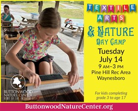 For students completing grade 3 through age 17. Textiles instruction from a Buttonwood educator who is a master weaver and textiles expert. Students learn skills with textiles such as wet and dry felting and weaving as they create several projects. After a lunch break, campers will enjoy a hike and different nature activities as we connect textiles to nature. All materials included in the camp fee, and each student will take home their completed projects. Students should pack a lunch and beverage. Camp fee: $60 for members of Buttonwood Nature Center, and $65 general public. Register online before July 7. For more information, email to jessica@buttonwoodnaturecenter.org.